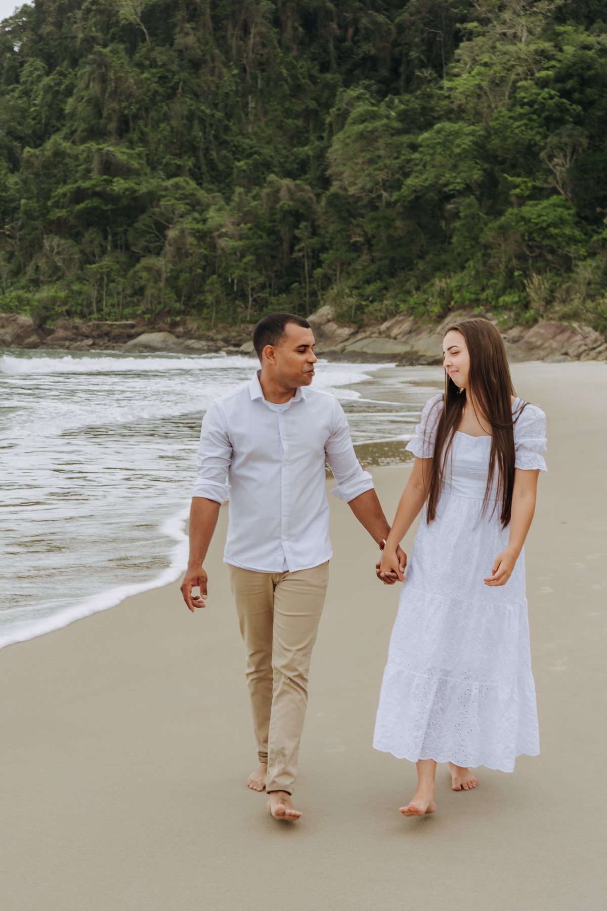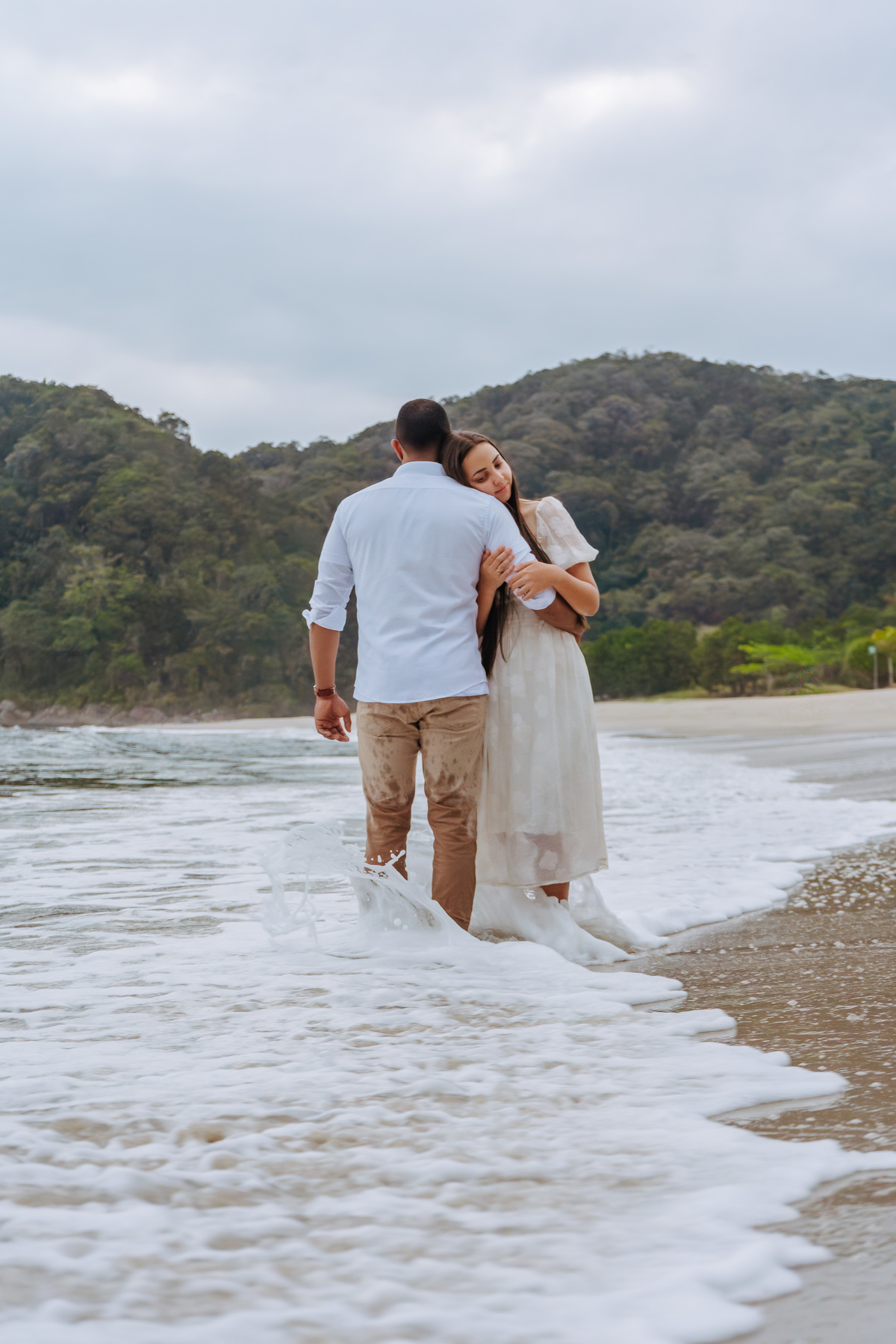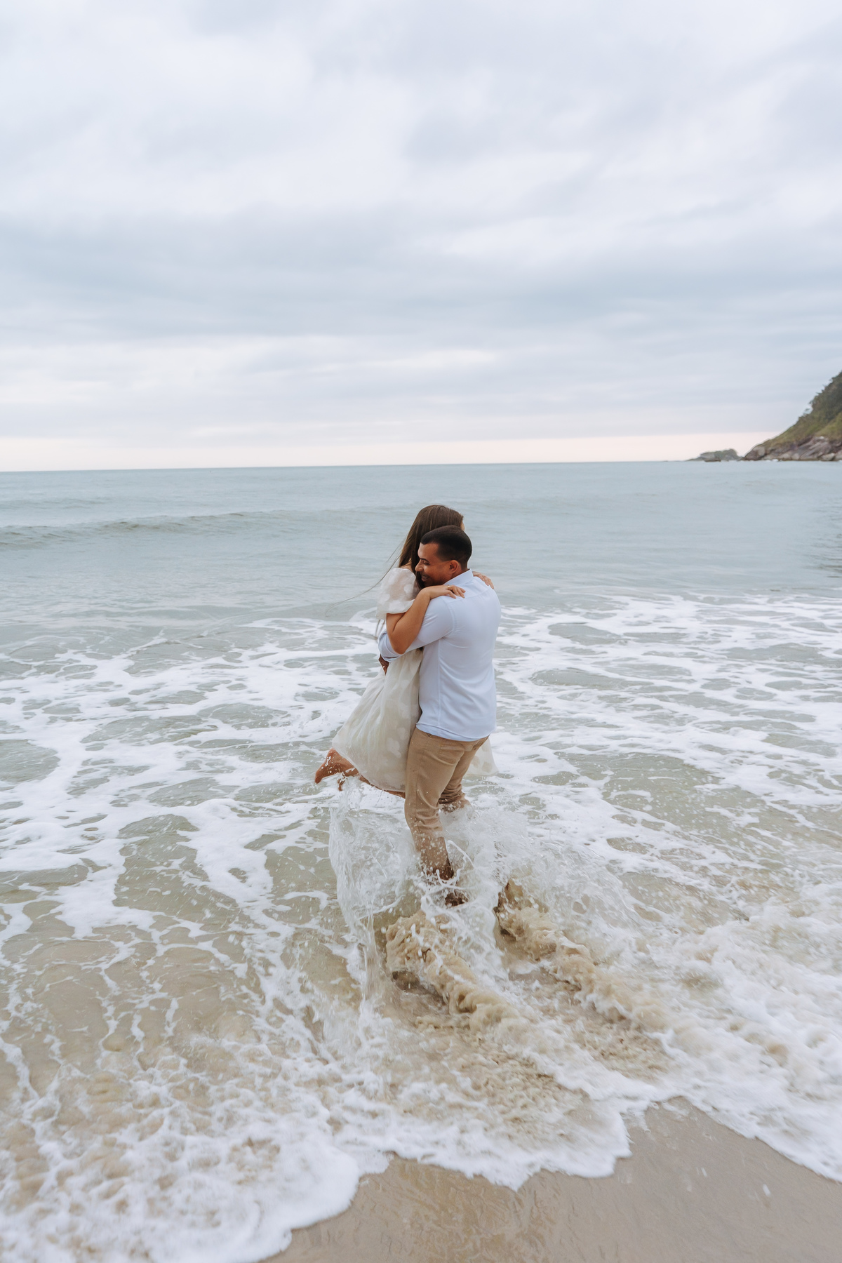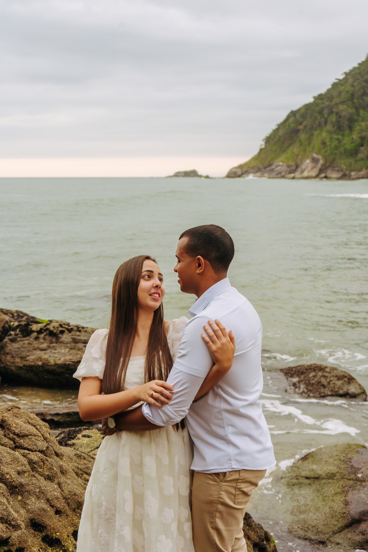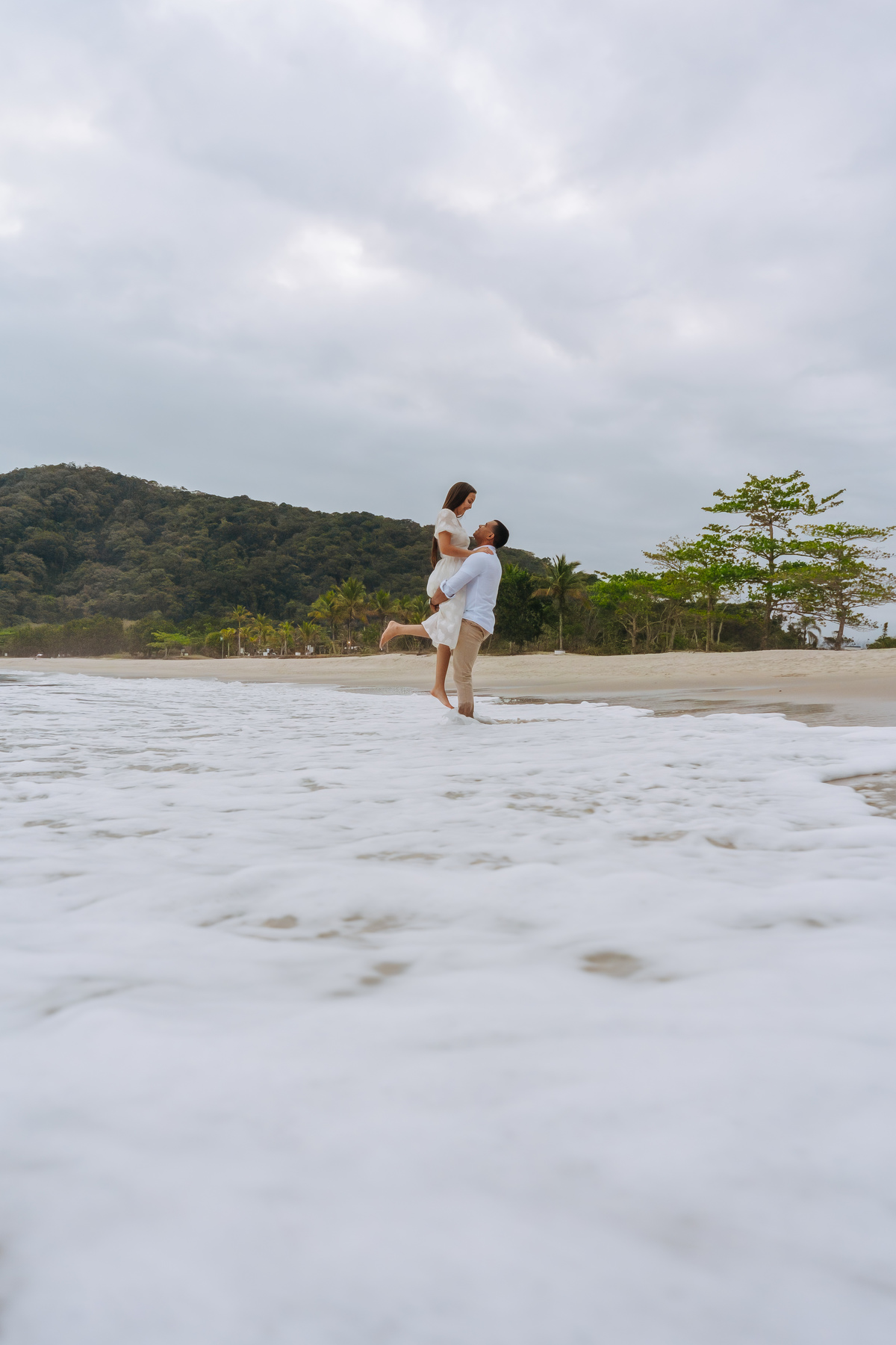 Na praia da Jureia, onde o mar encontra a areia em um ritmo calmo e constante, Iohanna e Natan viveram um ensaio cheio de leveza. O céu nublado trouxe uma luz suave, quase poética, criando aquela atmosfera serena que combina com momentos verdadeiros.